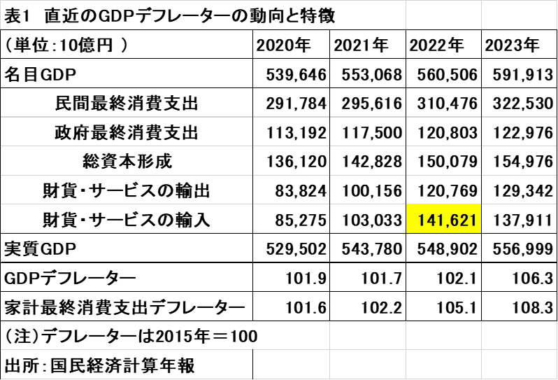GDPデフレーターは「名目GDP ÷ 実質GDP」で算出されます。表1を見ると、2022年の「財貨・サービスの輸入」が103兆330億円(2021年)から141兆6210億円へと、約38.6兆円も大幅に増加しています。これは対外的ショックによる輸入価格の急騰が原因です。