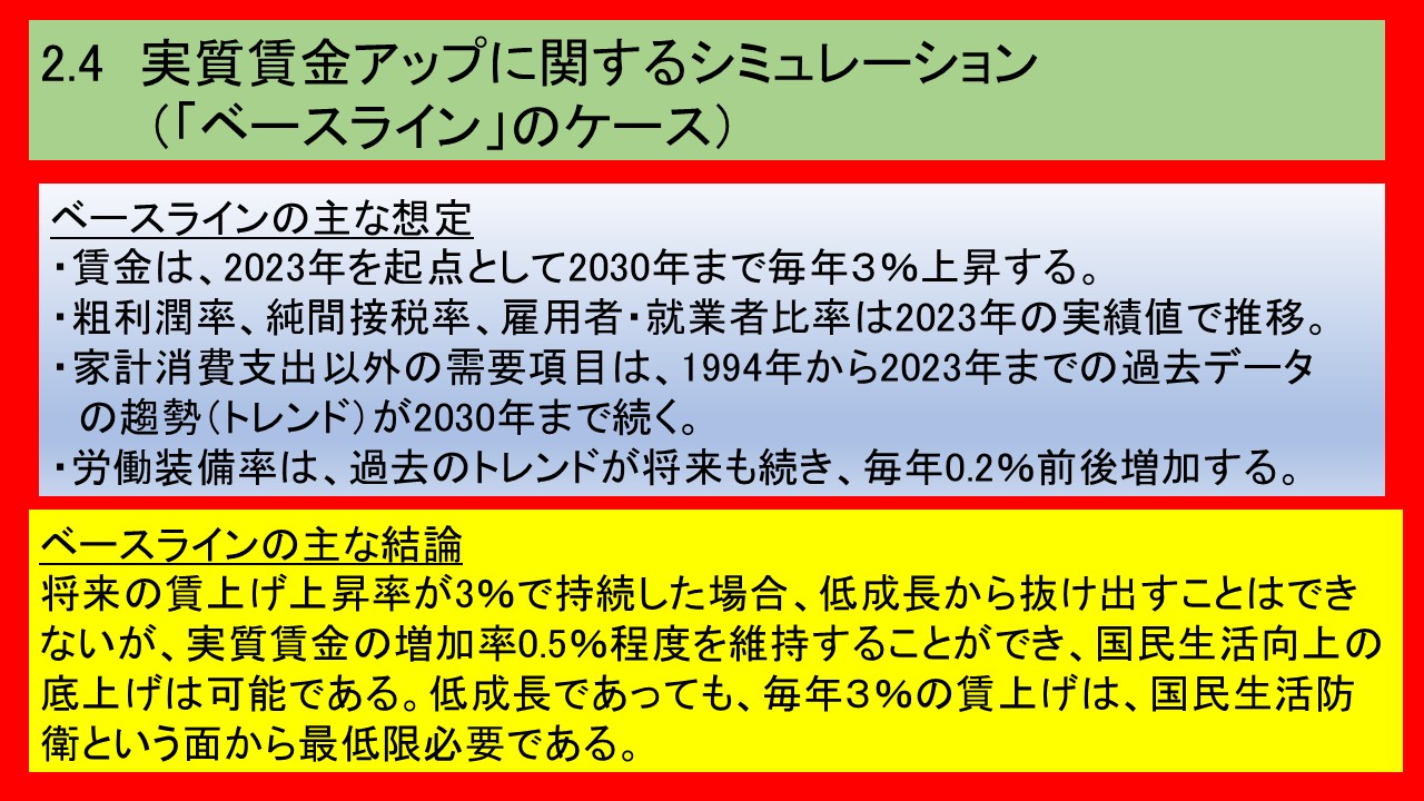 ベースラインでは、将来の賃上げ上昇率が3%で持続した場合、経済成長率は1%に満たない低成長から抜け出すことはできないが、実質賃金の前年比増加率は0.5%程度を維持することができるので、国民生活向上の底上げは可能ということになります。したがって、低成長であっても、毎年3%の賃上げを実現するということは、国民生活防衛という面からみると、最低限必要ということになります。