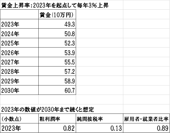 起点となる2023年の賃金は、493万円でした。毎年3%の賃上げが実現できるとすれば、2030年には、607万円まで増加します。2023年の粗利潤率、純間接税率、雇用者・就業者比率の実績値は、それぞれ、0.82、0.13、0.89であり、これらの数値が2030年まで続くと想定します(表1参照)。