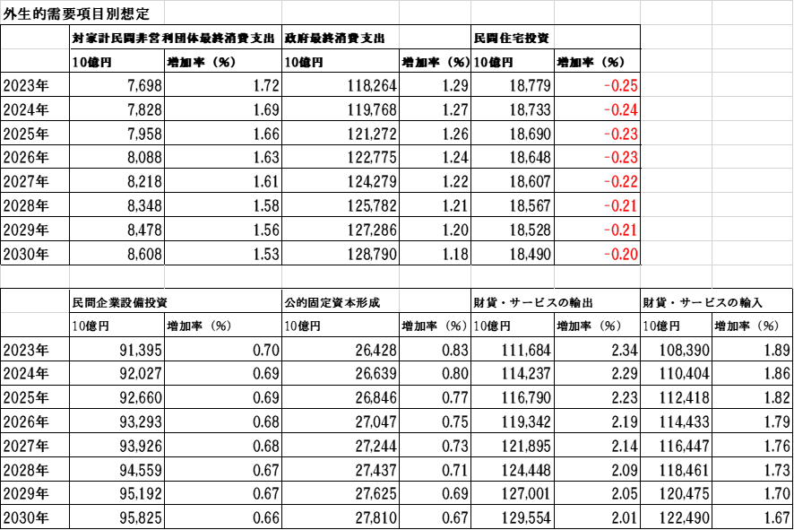 投資・輸出入など家計消費支出以外の需要項目は、1994年から2023年までの過去データの趨勢(トレンド)が2030年まで継続すると想定し、外生的に与えます。主な需要項目別の2030年までの前年比増加率をみてみると、民間企業設備投資増加率は、0.6%~0.7%の間で推移しており、安定的ですが、増加率は小さく1%を切っています。公的固定資本形成の増加率も同様な傾向を示しており、0.67%~0.83%と低くなっています。民間住宅投資は毎年0.2%程度低下し、下落傾向が続くとしています。財貨・サービスの輸出増加率は2%強、輸入増加率は2%を切った形で推移し、輸出は順調に増加する傾向を示しています。政府最終消費支出の増加率は、1.3%以下にとどまっています。経済成長の源泉ともいうべき外生的な需要項目別の増加率は低く、これが将来も低成長が続くであろうという根拠になります(表2参照)。