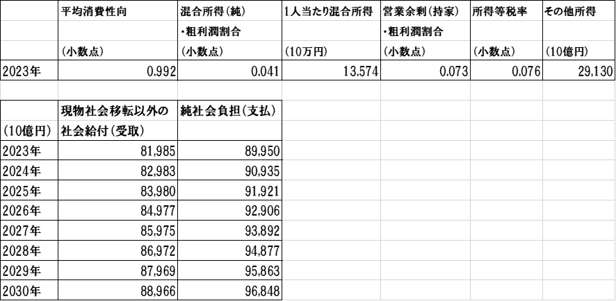 所得・富に課せられる経常税は、税引き前所得に所得等税率をかけてもとめます。所得等税率は、2023年の実績値が2030年まで同じと想定しました。純社会負担は主に現役世代が納める社会保険料ですが、これも1994年から2023年までの過去の趨勢がそのまま続くとして、将来値を外生的与えます。