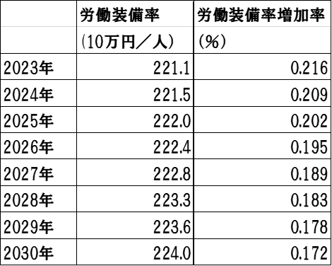 就業者数は、資本ストックを労働装備率(=資本ストック/就業者数)で除してもとまります。資本ストックは生産活動に寄与するもので、前年の資本ストック(減価償却後)に今年の民間企業設備投資と公的固定資本形成の合計を足してもとまります。民間企業設備投資と公的固定資本形成は、前述したように、1994年から2023年までの過去データの趨勢(トレンド)が2030年まで継続すると想定した数値になっています。減価償却率は2023年の数値をそのまま採用します。労働装備率については、過去のトレンドが将来も続くと想定すると、毎年0.2%前後増加することになります。国民経済全体でみると、技術進歩はゆっくりですが、着実に実装化されることになります。