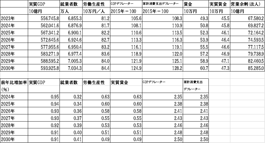 物価決定に関する想定:物価の指標は、基本的にGDPデフレーターを採用しています。GDPデフレーターの決定要因のうち、賃金は、2023年を起点として、2030年まで毎年3%上昇すると想定します。企業等の粗利潤率、政府の純間接税率、雇用者・就業者比率は2023年の実績値が2030年まで一定に推移すると想定します。
