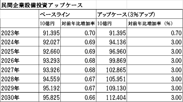 ベースラインでは民間設備投資の伸びを年率約0.7%弱と想定しましたが、これを年率3%まで引き上げた事例を「ケース1」と定義します。これは民間企業の投資意欲がより活発になった状態を指します。 この場合、2030年の実質の民間設備投資は、ベースラインの約95.8兆円に対し、約112.4兆円まで大幅に拡大します(表1参照)。