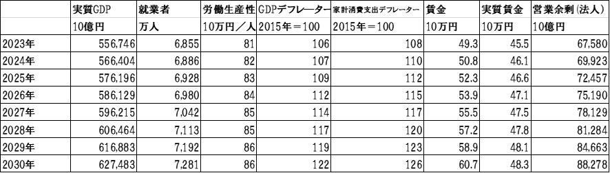 ➀賃金は、2023年を起点として、2030年まで毎年3%上昇する。