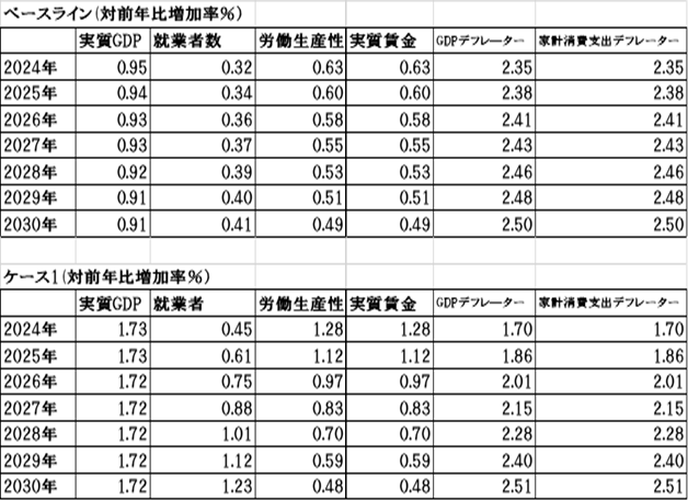 それに対して、ケース1の労働生産性上昇率は、1.28%(2024年)と比較的高いですが、その後逓減傾向を示し、2030年には、0.48%まで落ち込みます。2030年は、ベースラインより低くなっています。